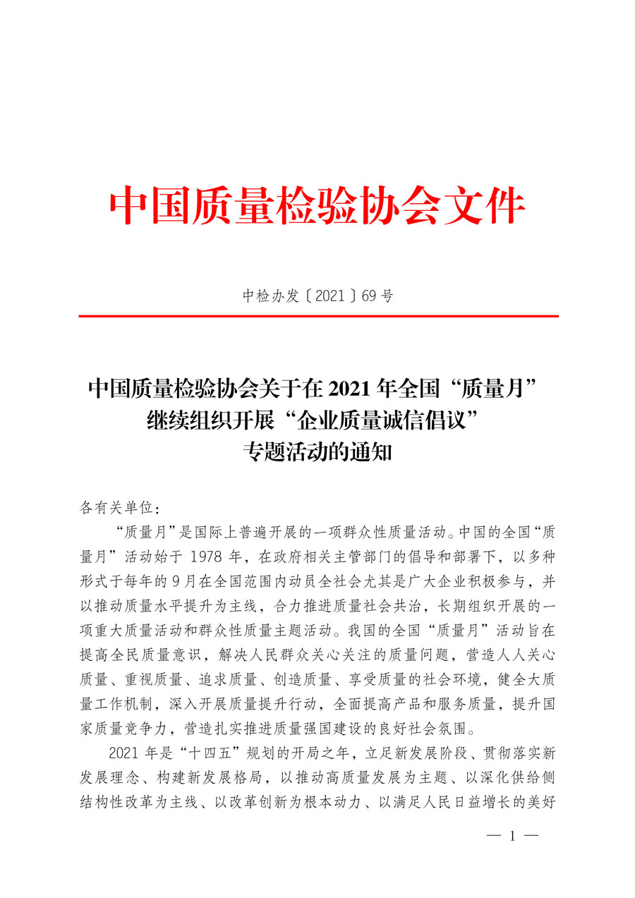 中國質量檢驗協會關于在2021年全國“質量月”
