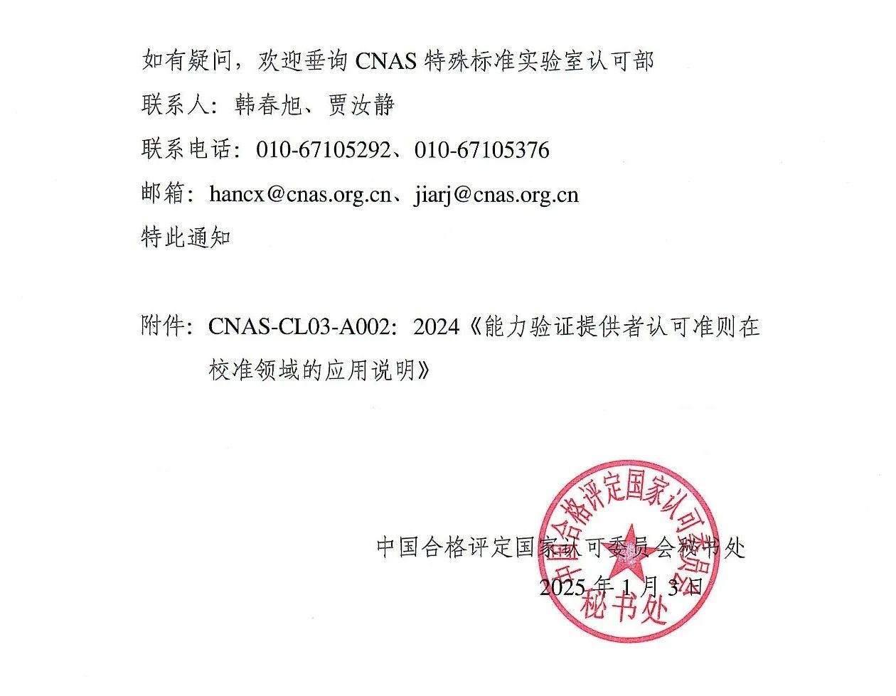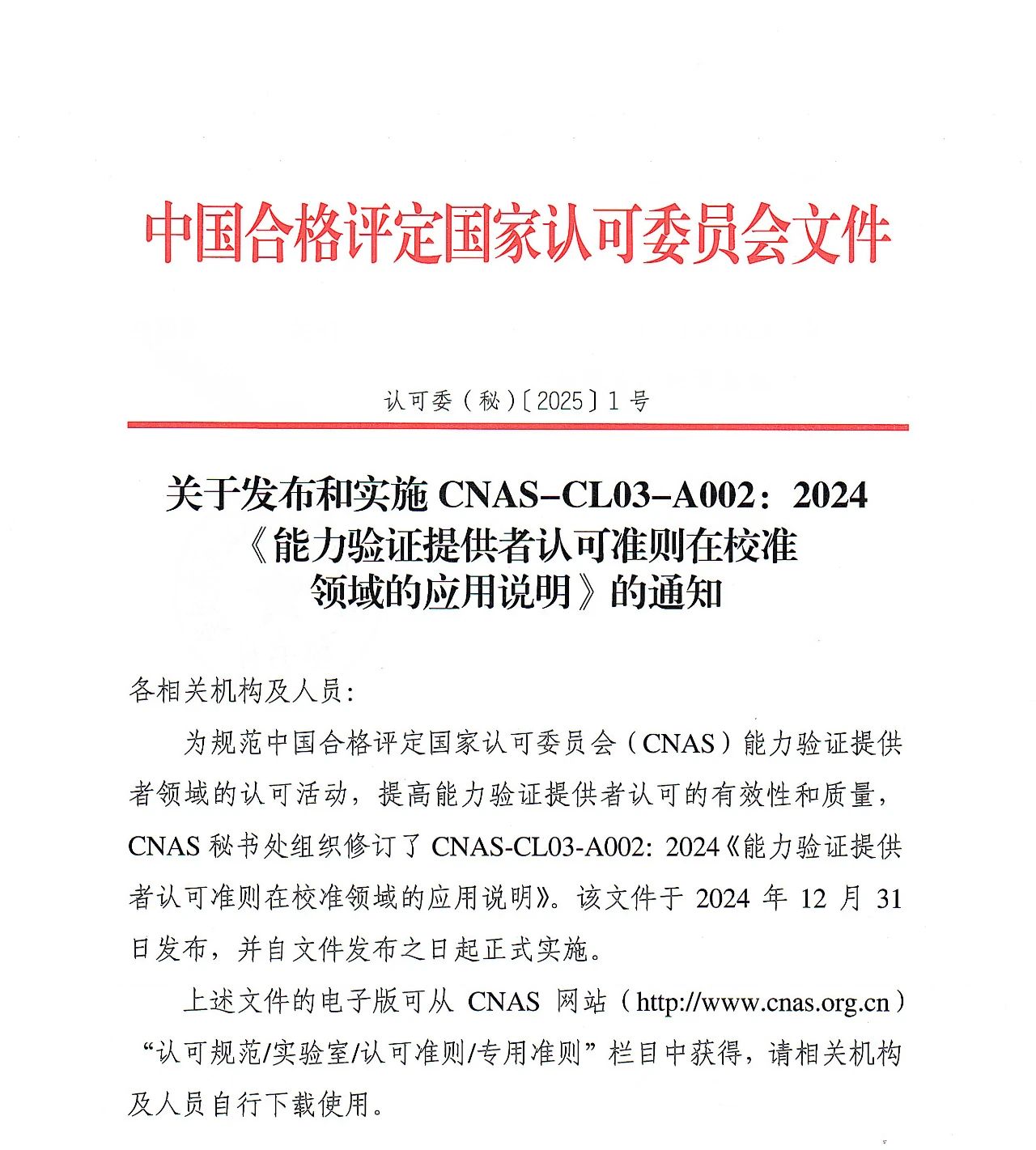 近日,中國合格評定國家認可委員會(CNAS)發(fā)布通知,CNAS 秘書處組織修訂了CNAS-CL03-A002:2024《能力驗證提供者認可準則在校準領域的應用說明》。該文件于2024年12月31日發(fā)布,并自文件發(fā)布之日起正式實施。