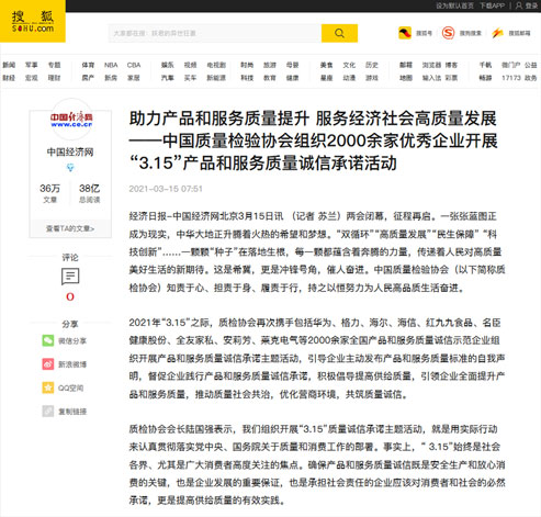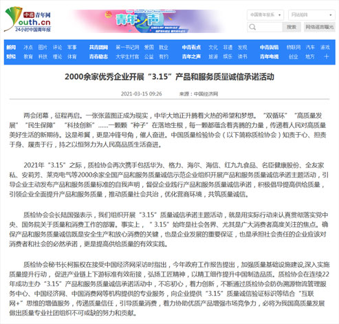 中國經濟網:傳遞質量信任、引導質量消費,我們堅持在行動!——中國質量檢驗協會組織2000余家優秀企業在2021年“3.15”開展產品和服務質量誠信承諾主題活動