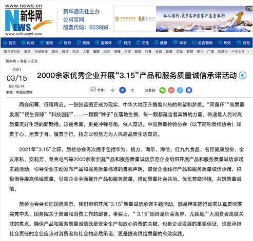 新華網:2000余家優秀企業開展“3.15”產品和服務質量誠信承諾活動