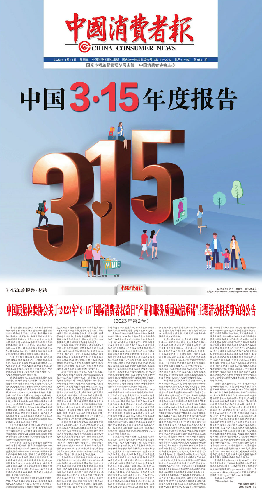中國(guó)消費(fèi)者報(bào):中國(guó)質(zhì)量檢驗(yàn)協(xié)會(huì)關(guān)于2023年“3·15”國(guó)際消費(fèi)者權(quán)益日“產(chǎn)品和服務(wù)質(zhì)量誠(chéng)信承諾”主題活動(dòng)相關(guān)事宜的公告