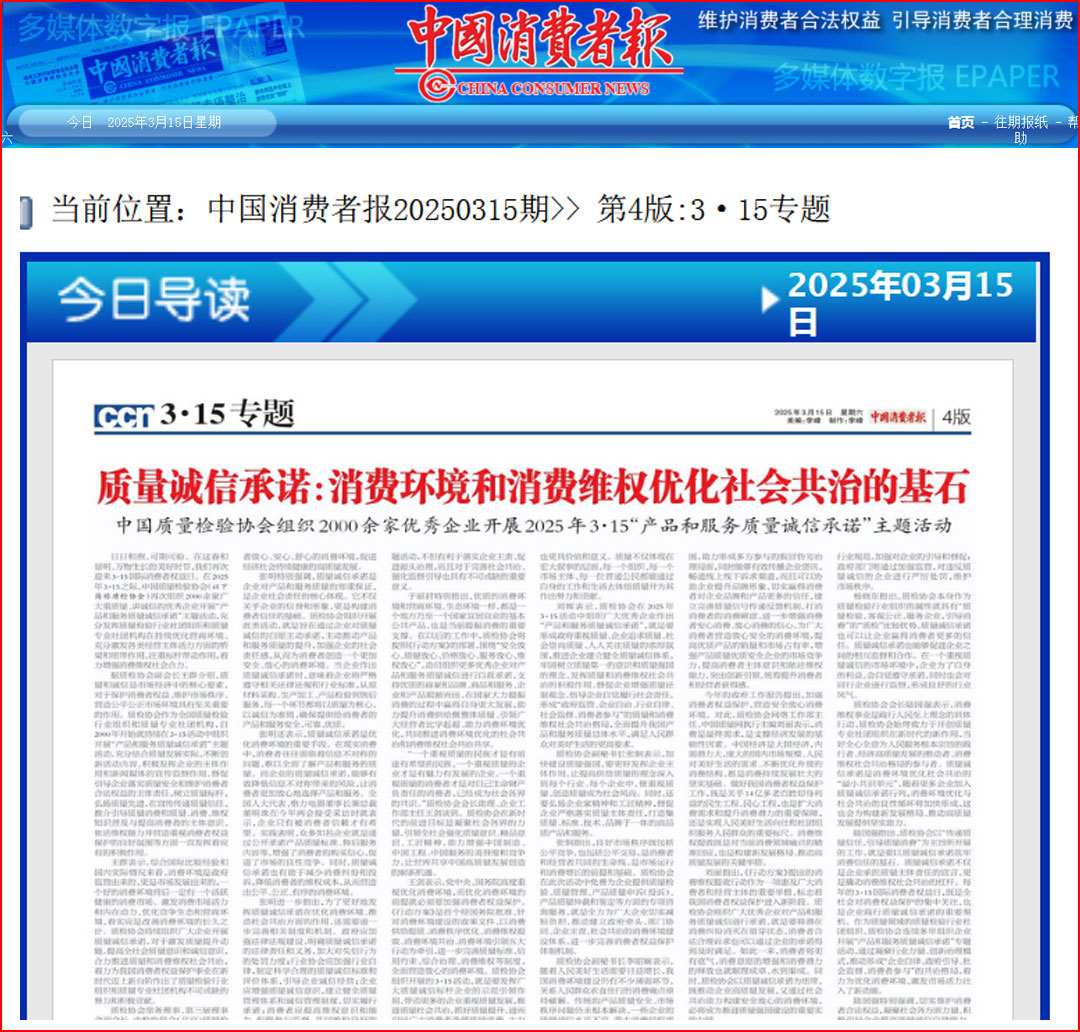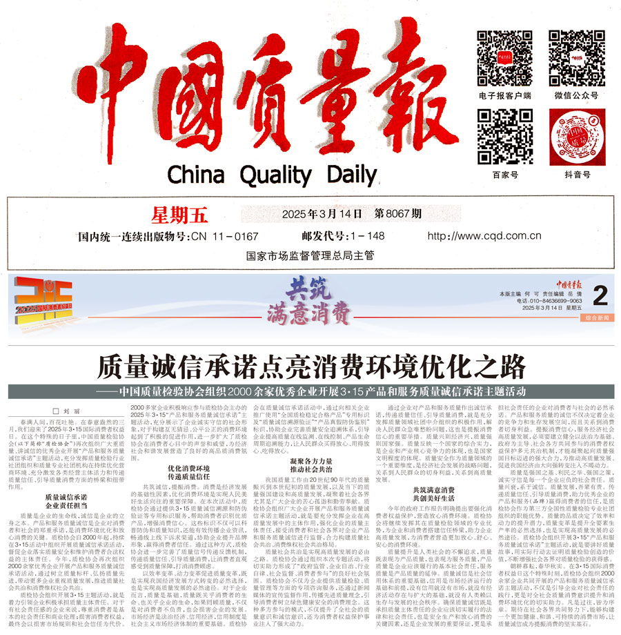 《中國質量報》(2025年3月14日刊)發布:質量誠信承諾點亮消費環境優化之路——中國質量檢驗協會組織2000余家優秀企業開展3·15產品和服務質量誠信承諾主題活動