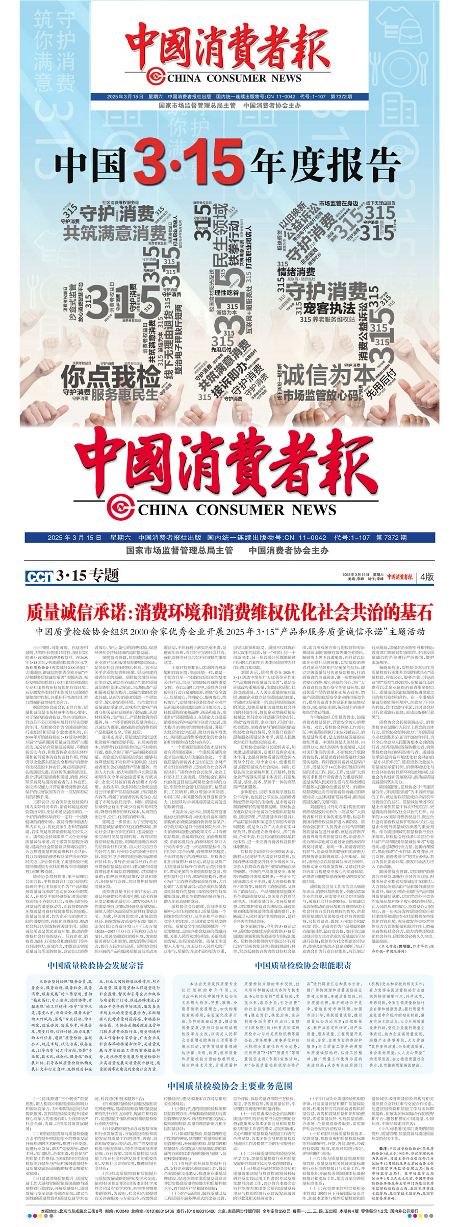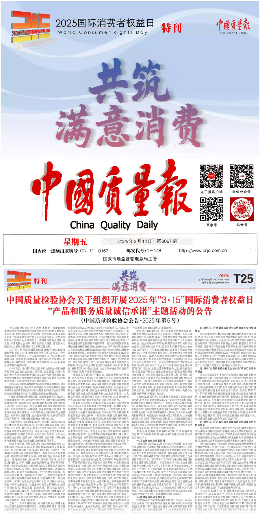 《中國質量報》(2025年3月14日刊)發布:中國質量檢驗協會關于組織開展2025年“3·15”國際消費者權益日“產品和服務質量誠信承諾”主題活動的公告(2025年第6號)