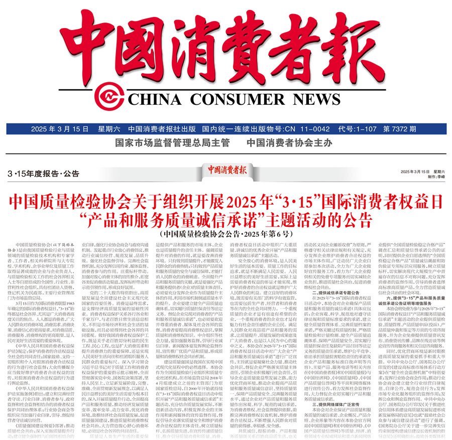 《中國消費者報》(2025年3月15日刊)發布:中國質量檢驗協會關于組織開展2025年“3·15”國際消費者權益日“產品和服務質量誠信承諾”主題活動的公告(2025年第6號)