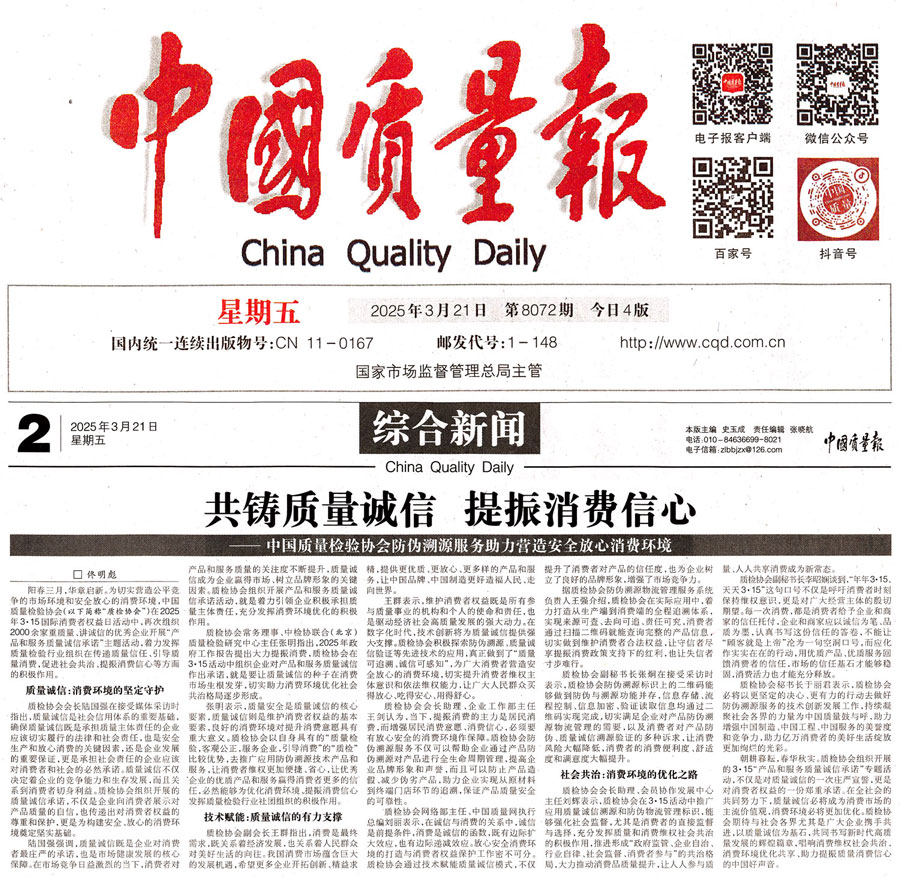 《中國質量報》(2025年3月21日刊)發布:共鑄質量誠信 提振消費信心——中國質量檢驗協會防偽溯源服務助力營造安全放心消費環境