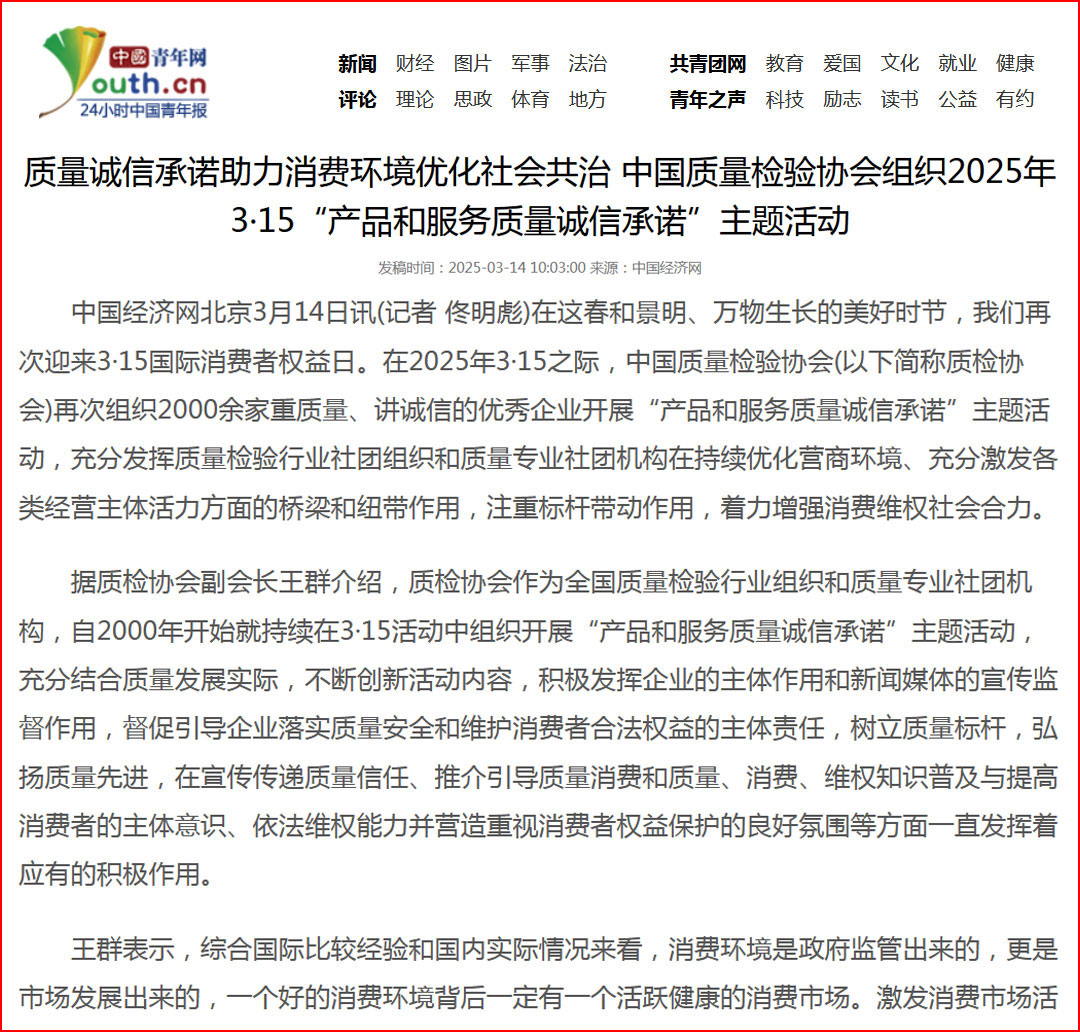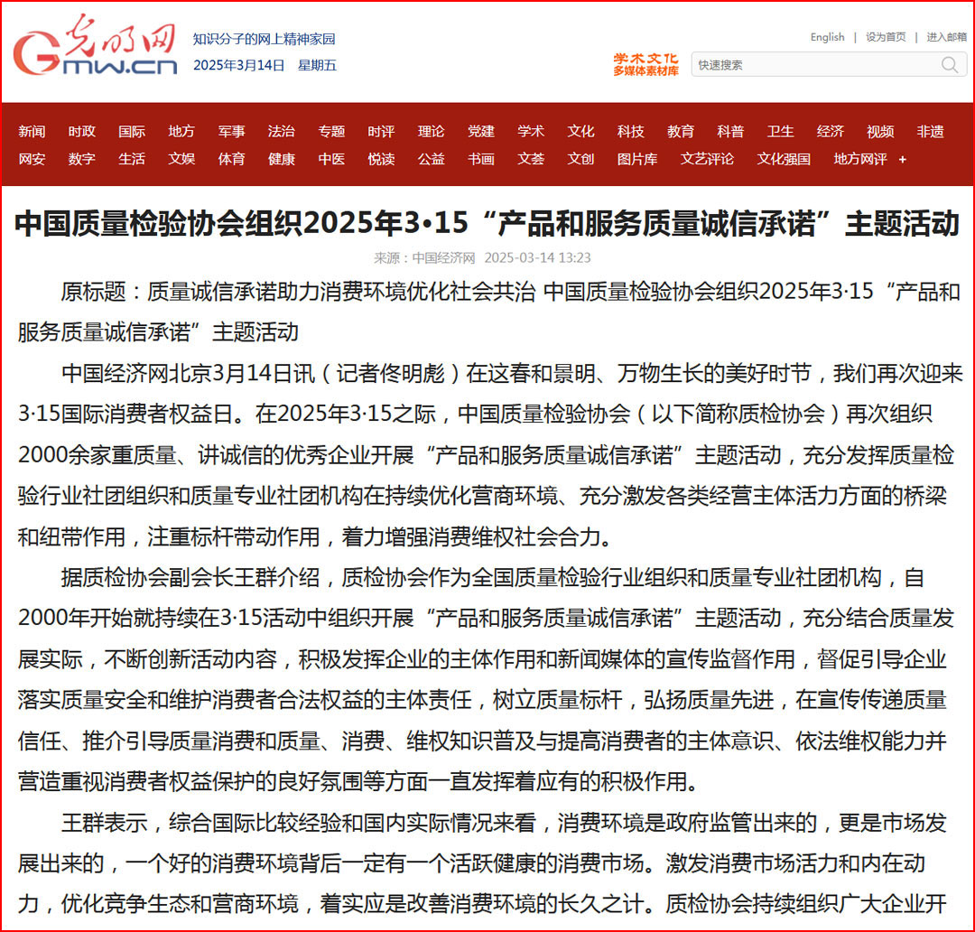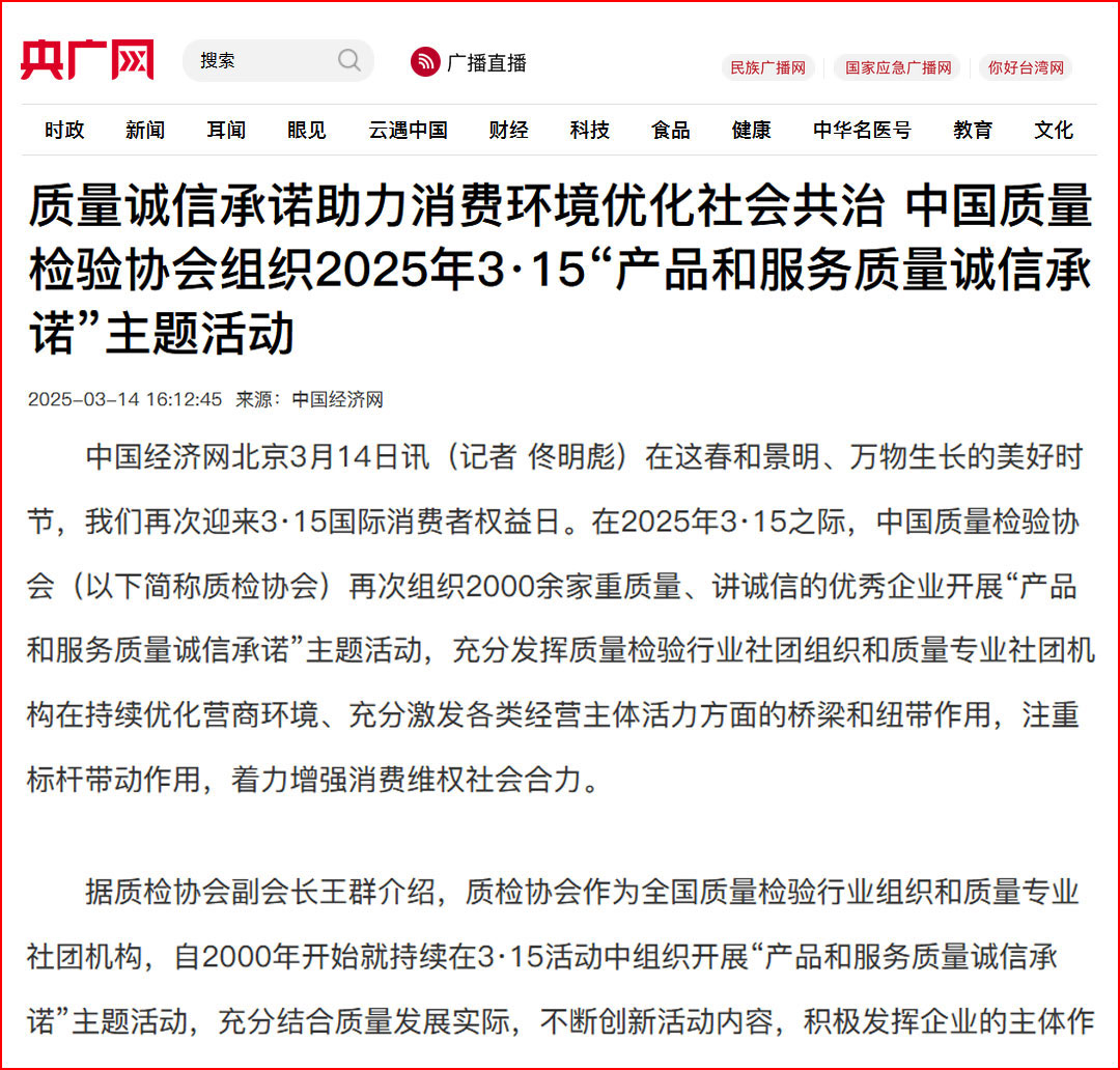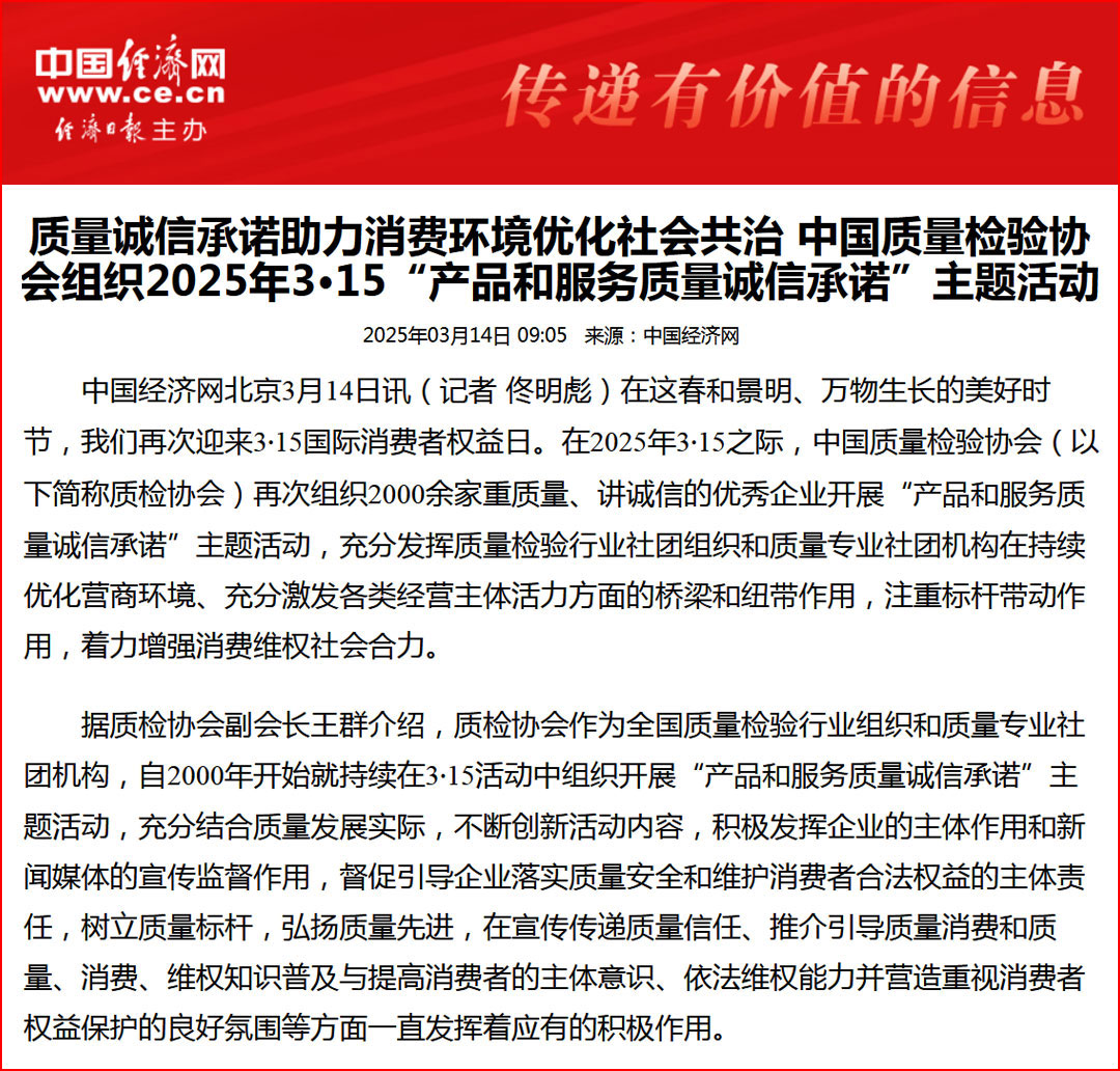 中國經濟網“質量經濟頻道”發布:中國質量檢驗協會開展2025年3·15“產品和服務質量誠信承諾”主題活動