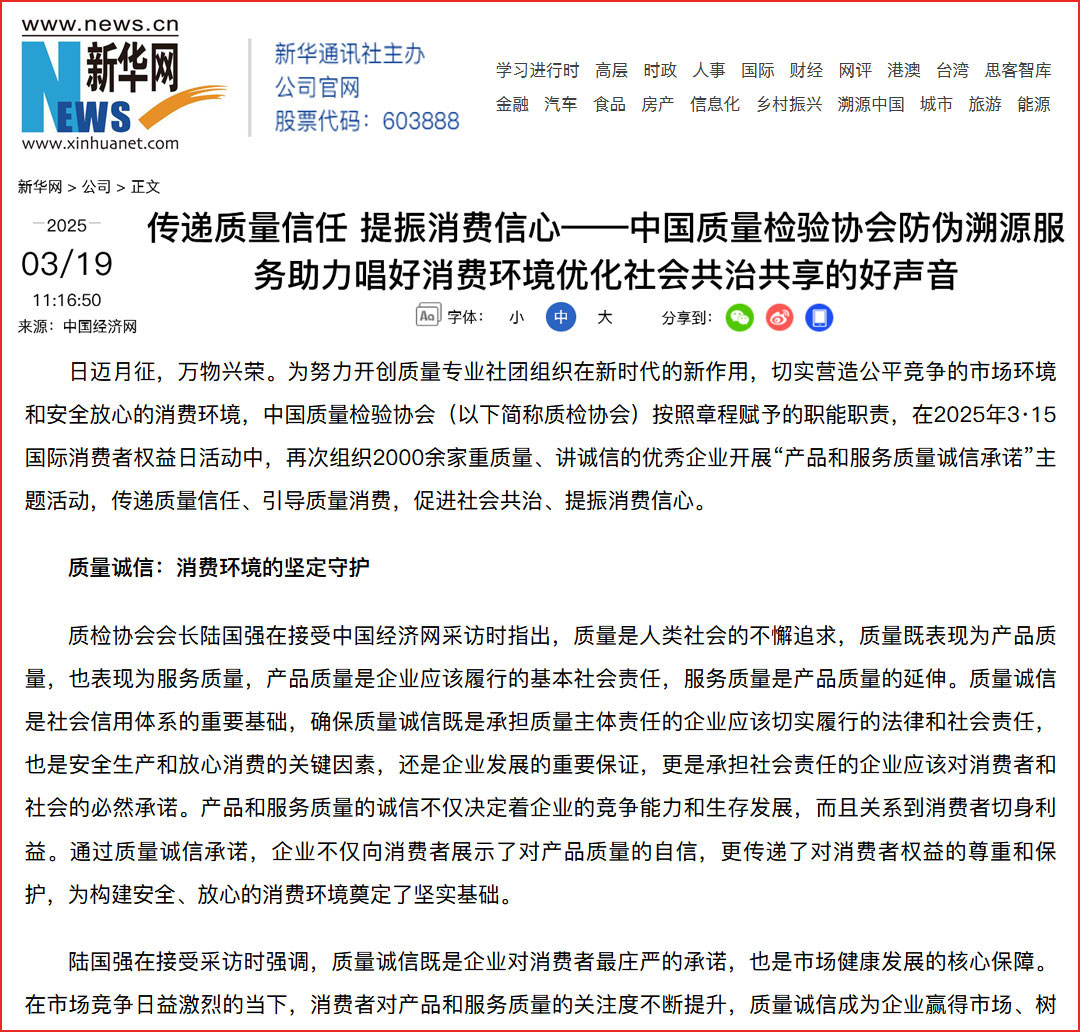 新浪網報道:中國質檢協會:推動防偽溯源服務賦能 優化消費環境提振消費