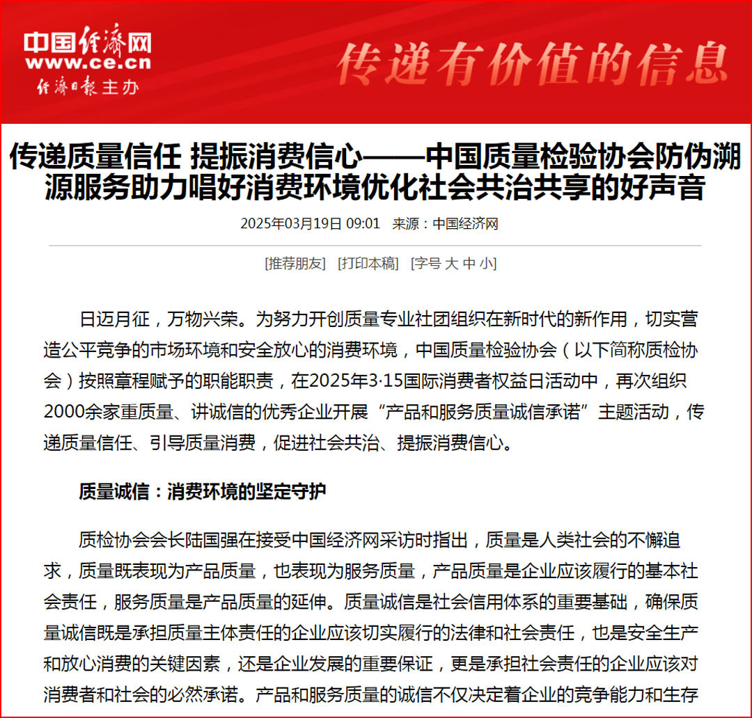 中國經濟網“質量經濟頻道”發布:質量誠信承諾:消費環境和消費維權優化社會共治的基石——中國質量檢驗協會組織2000余家優秀企業開展2025年3·15“產品和服務質量誠信承諾”主題活動
