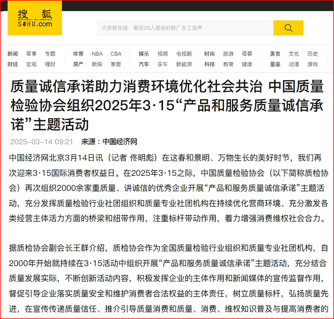 搜狐網報道:質量誠信承諾助力消費環境優化社會共治——中國質量檢驗協會組織2025年3·15“產品和服務質量誠信承諾”主題活動