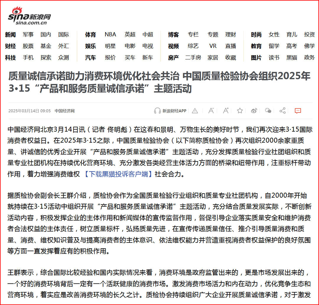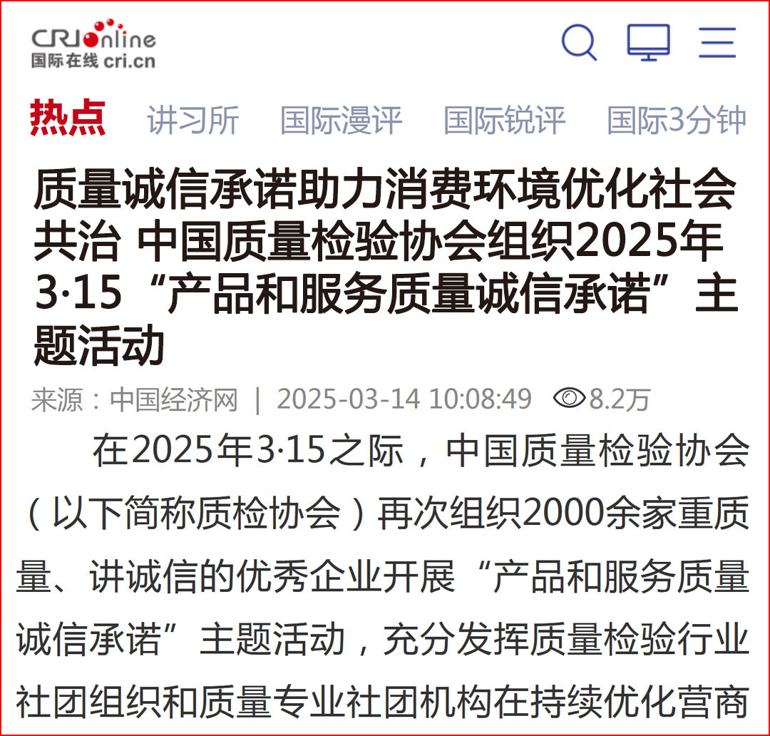 中金在線報道:質量誠信承諾助力消費環境優化社會共治——中國質量檢驗協會組織2025年3·15“產品和服務質量誠信承諾”主題活動