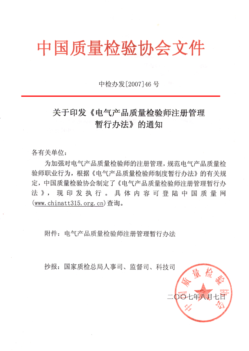 關于印發《電氣產品質量檢驗師注冊管理暫行辦法》的通知