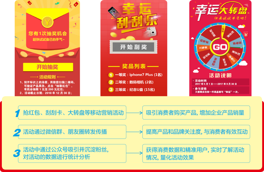 消費者購買企業的產品后,掃描標識上的二維碼,參與企業設置的搶紅包、刮刮卡、大轉盤等營銷互動活動,中獎后直接進入微信公眾號領取,操作簡單方便,在實現企業促進產品銷售的同時,還可增加企業微信公眾號的粉絲數量;同時,充分利用移動互聯網易于傳播的特性,實現企業品牌的廣泛傳播,采用多種移動創新營銷方式,結合數據統計分析,幫助企業實現精準營銷;另外,通過抽獎、助力、積分兌換等主流營銷活動,吸引、刺激消費者持續消費、分享傳播,進而有效提高企業的產品銷量;還有,也可針對企業某一種產品進行單獨促銷開展營銷活動,消費者掃描二維碼參與營銷互動活動,輕松實現促銷之目的,收集營銷活動數據,借助大數據分析,分析消費者的特征、分布、消費習慣等信息,引導企業的市場營銷戰略和銷售策略,使企業營銷舉措更加精準有效。