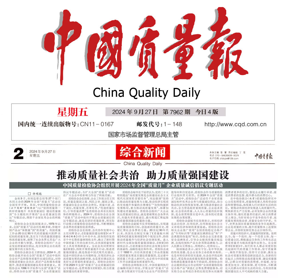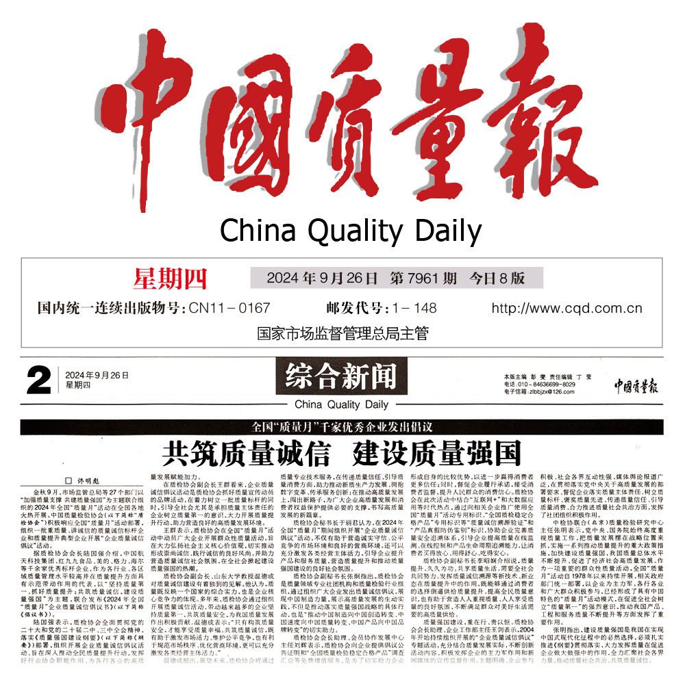 - 中國質量報—堅持質量第一抓好質量提升 共筑質量誠信 建設質量強國——2024年全國“質量月”企業質量誠信倡議書(2024年9月·北京)