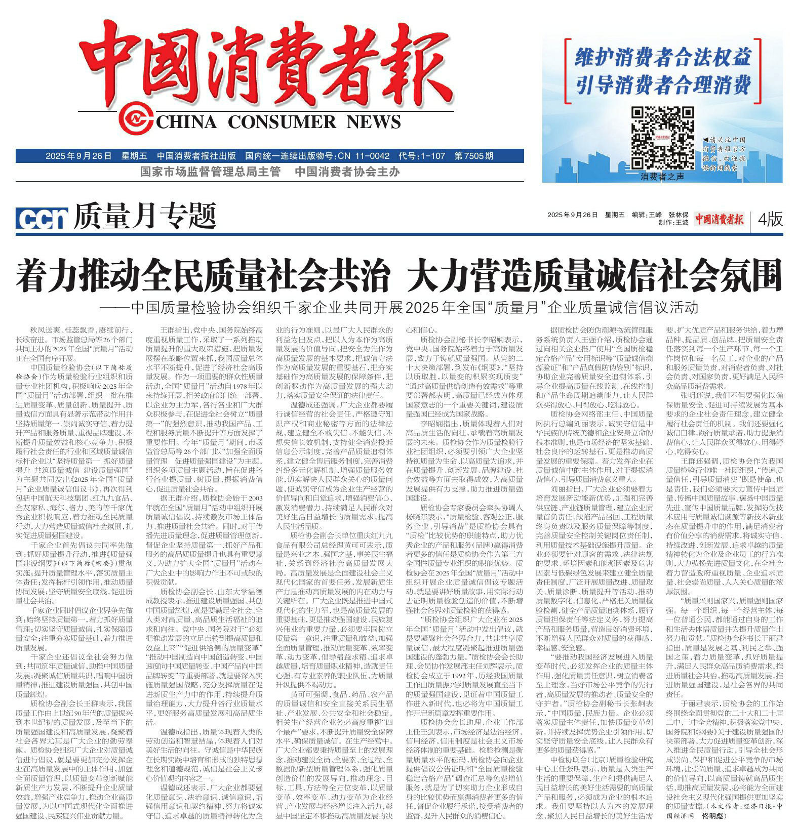 - 《中國消費者報》(2025年9月26日刊)發布:著力推動全民質量社會共治 大力營造質量誠信社會氛圍——中國質量檢驗協會組織千家企業共同開展2025年全國“質量月”企業質量誠信倡議活動