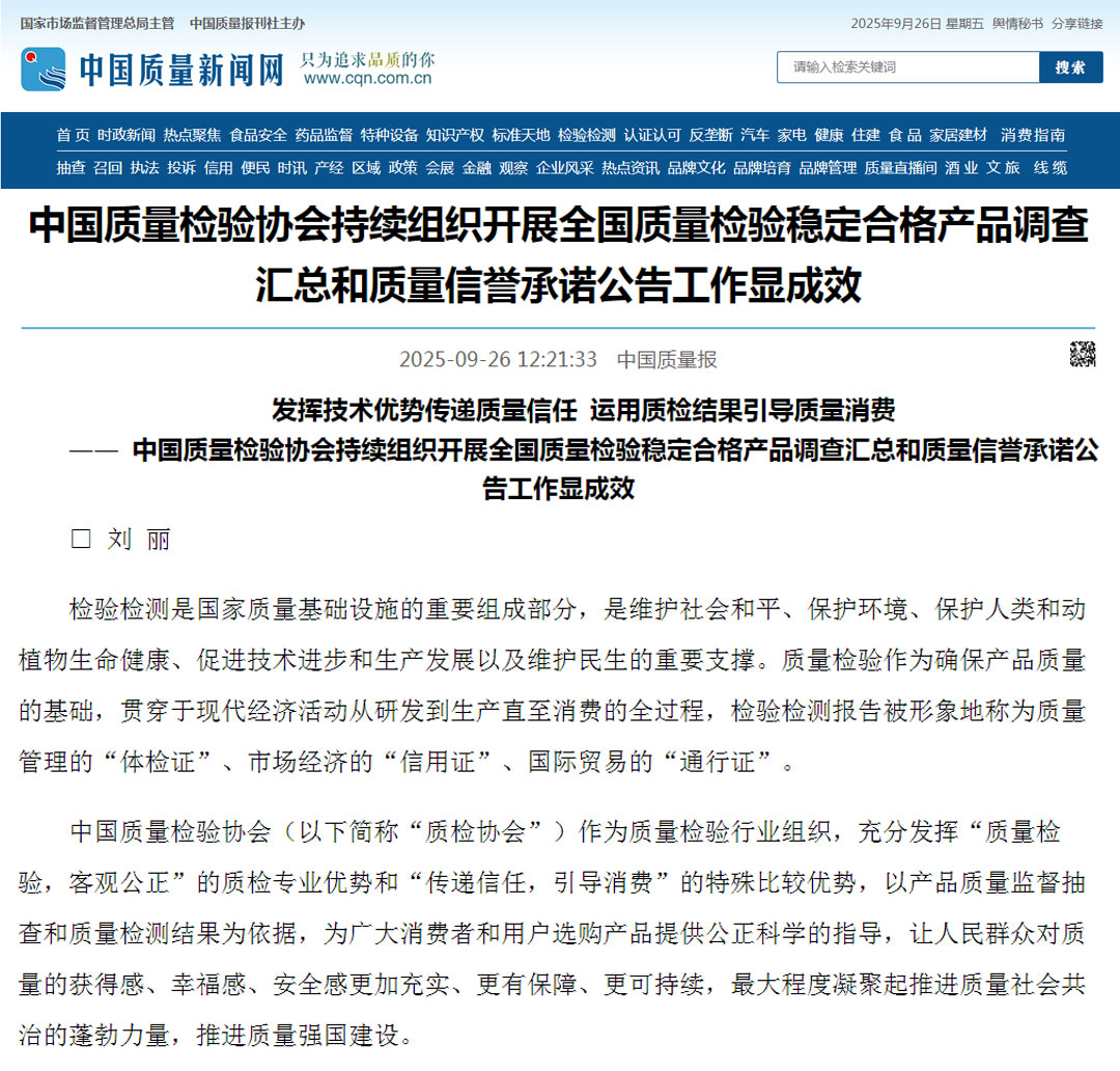 - 《中國質量報》(2025年9月26日刊)發布:發揮技術優勢傳遞質量信任 運用質檢結果引導質量消費————中國質量檢驗協會持續組織開展全國質量檢驗穩定合格產品調查匯總和質量信譽承諾公告工作顯成效